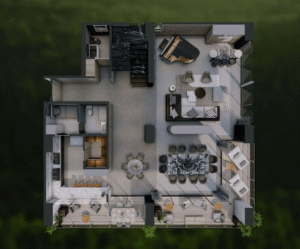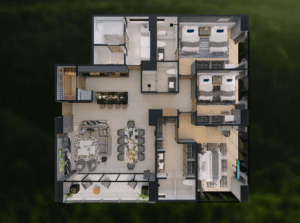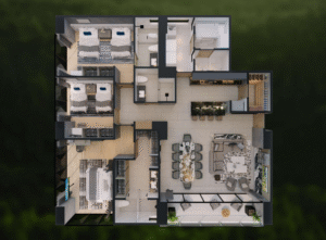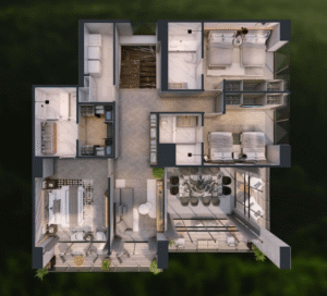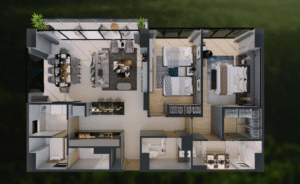 Este departamento Tipo 2A mantiene el estándar de lujo y amplitud de Realeza, con una configuración de tres recámaras y un diseño optimizado para el esparcimiento y la vida social.